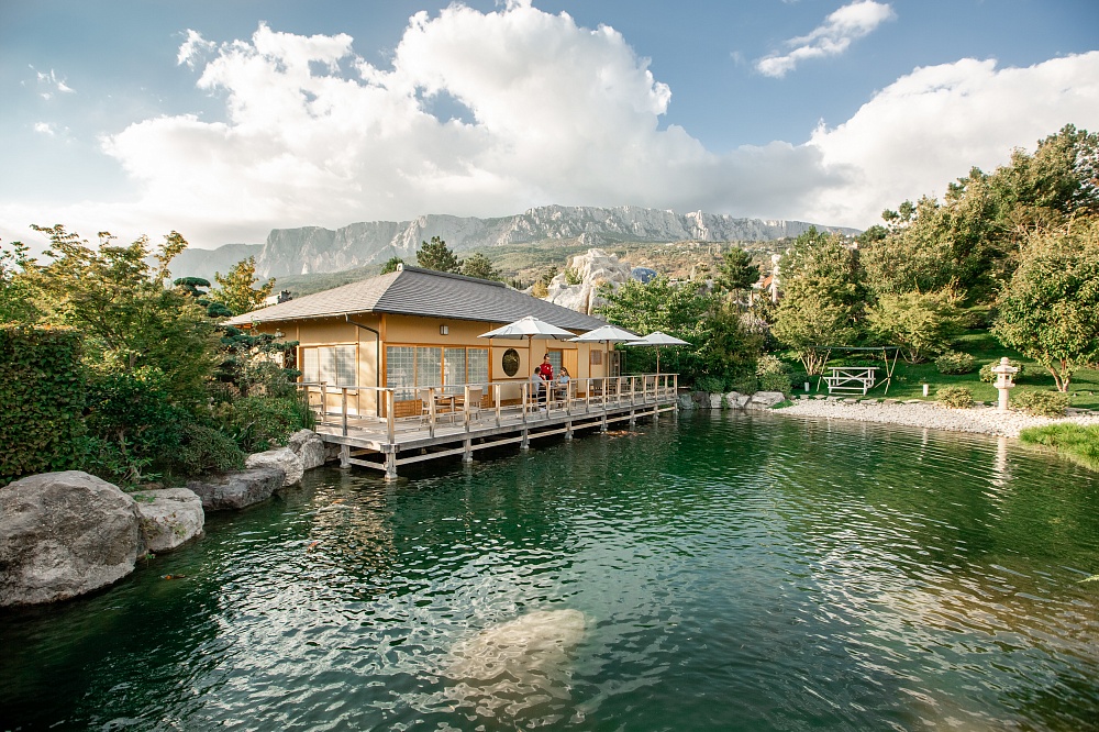 Для создания традиционных строений и сложного ландшафта из Японии морем доставили дерево и 1700 тонн камней вулканической породы. Ворота сада, Чайный домик, храм медитации Дзен-До, и имение Сёгуна построены из японского кипариса, согласно канонам аутентичной архитектуры, без единого гвоздя. Мостики, тропинки, термальные купели — каждый элемент не случаен и таит глубокую мудрость.