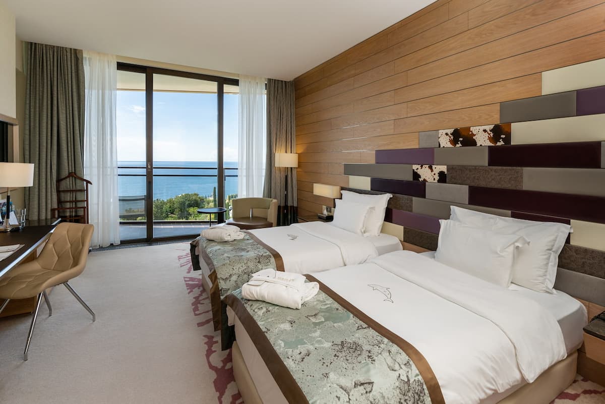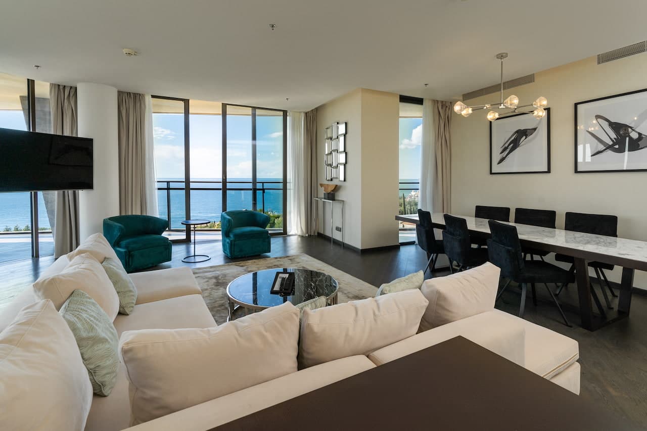 Элегантный номер предлагает гостям огромную гостиную, две спальни с собственными санузлами, обзорный балкон с террасой с шезлонгами и восхитительные виды Крымской Ривьеры.