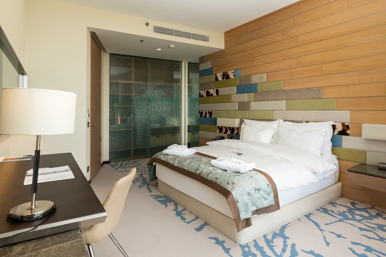 Пространство апартаментов продумано и многофункционально. Здесь можно отдохнуть и расслабиться, встретиться с друзьями и переговорить с партнерами, пообедать с семьей и поработать. В гостиной расположены уютные зоны отдыха, большой обеденный стол и удобное рабочее место. Авторский дизайн интерьера воплощен в приятных светлых тонах и дополнен яркими акцентами. Разнообразие фактур создает роскошные контрасты, а правильное освещение выгодно подчеркивает детали. На каждом этаже расположен только один номер категории «Королевский люкс».